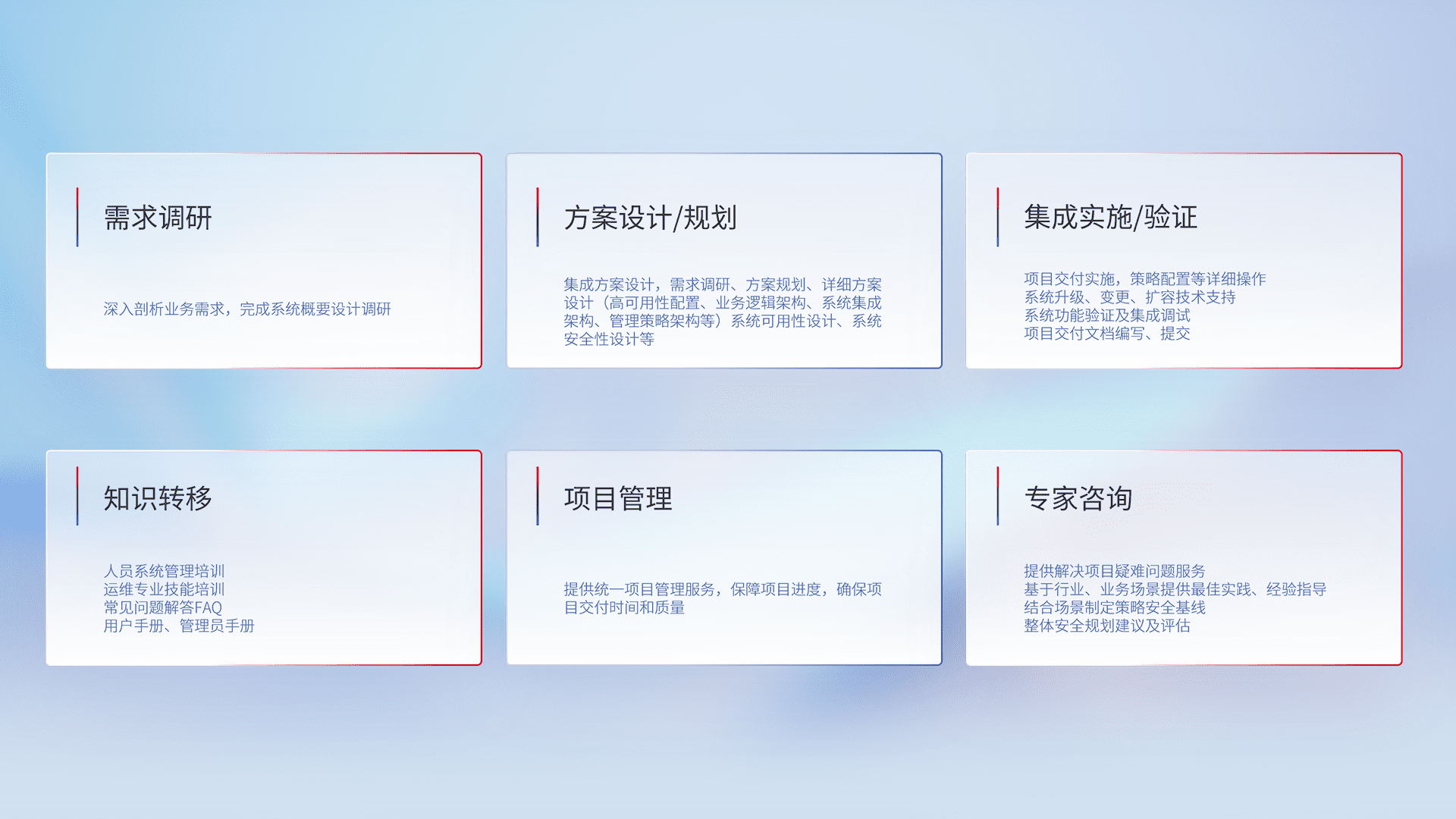 针对客户行业特性,,将宏观的安全战略和需求,,,通过专业的交付服务,,,,实现项目落地,,,为客户提供标准规范的集成交付服务。。